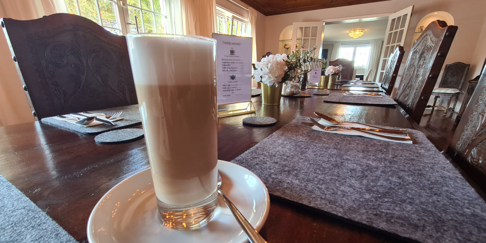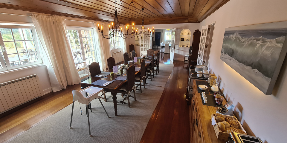 Portuguese breakfast buffet with specialties from local producers, freshly prepared egg varieties and coffee as from a barista, on the large dining table in the elegant breakfast room or on the extensive terrace, each with view into the park – Good morning at Quinta do Cabo Guesthouse. |